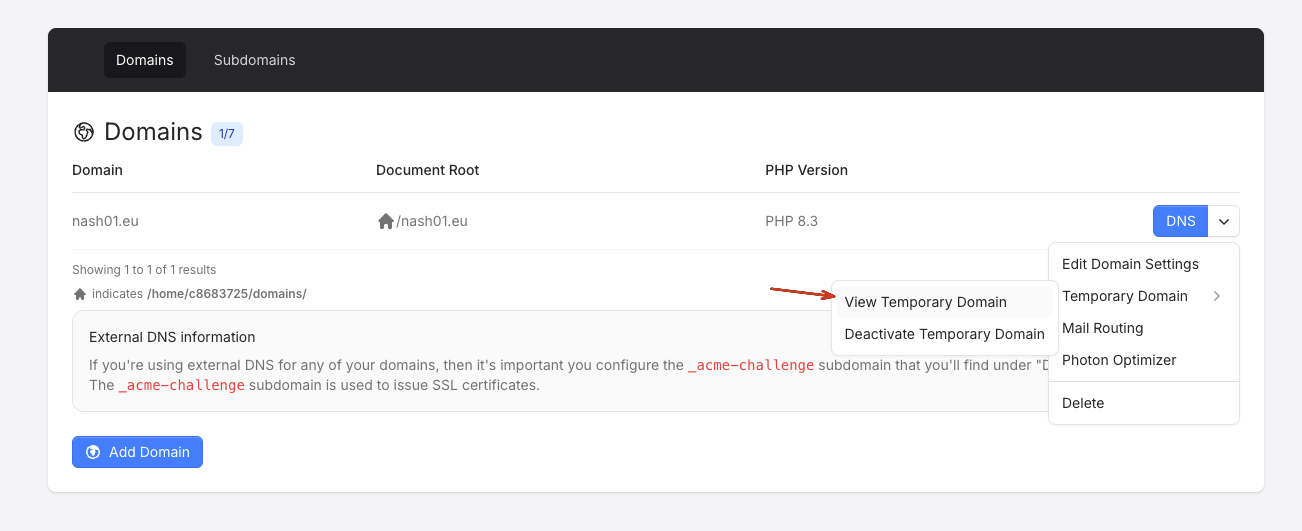 Please note that the temporary domain takes roughly 10-15 seconds to activate after you’ve clicked on the “Activate Temporary Domain” button.