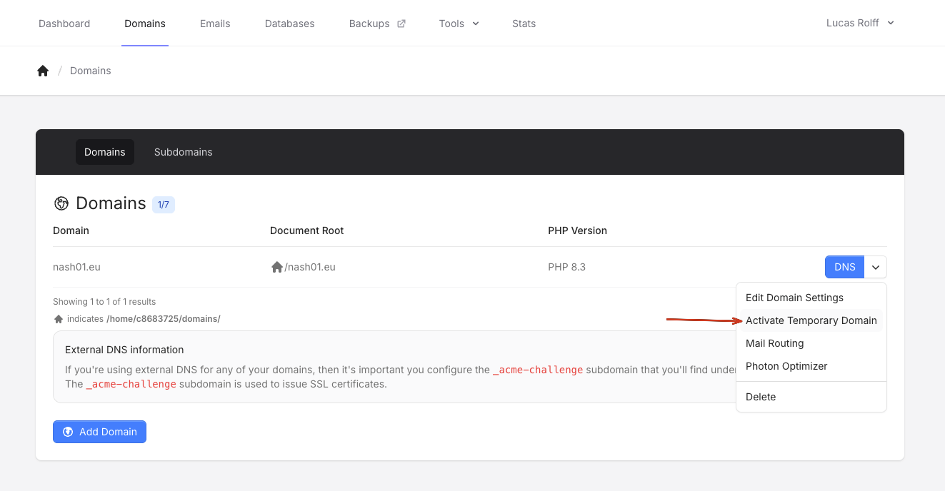 On the Domains page, open the drop-down for the domain and choose Activate Temporary Domain.